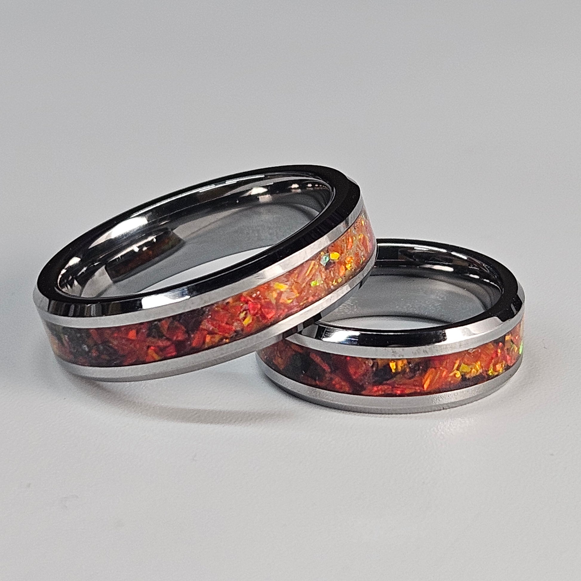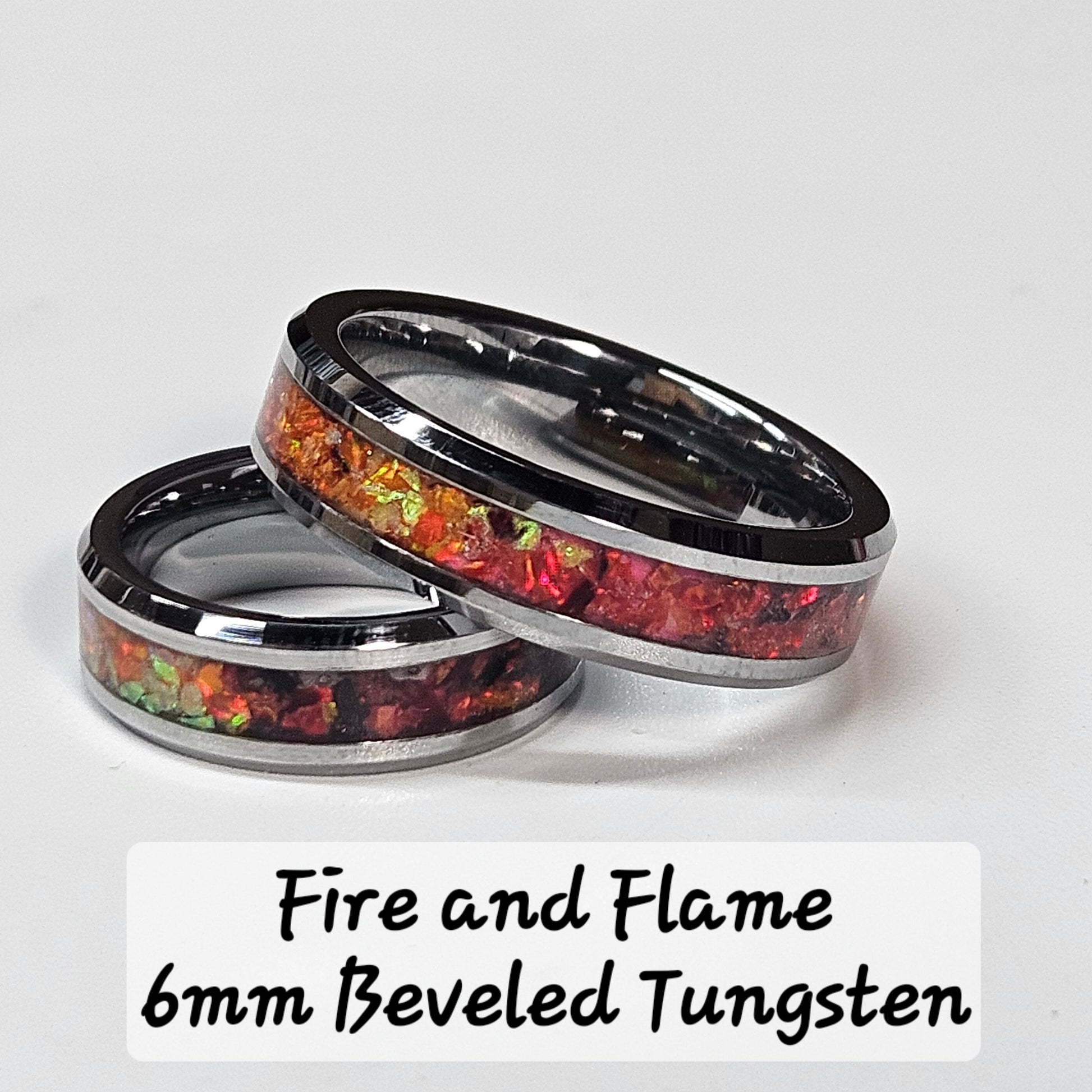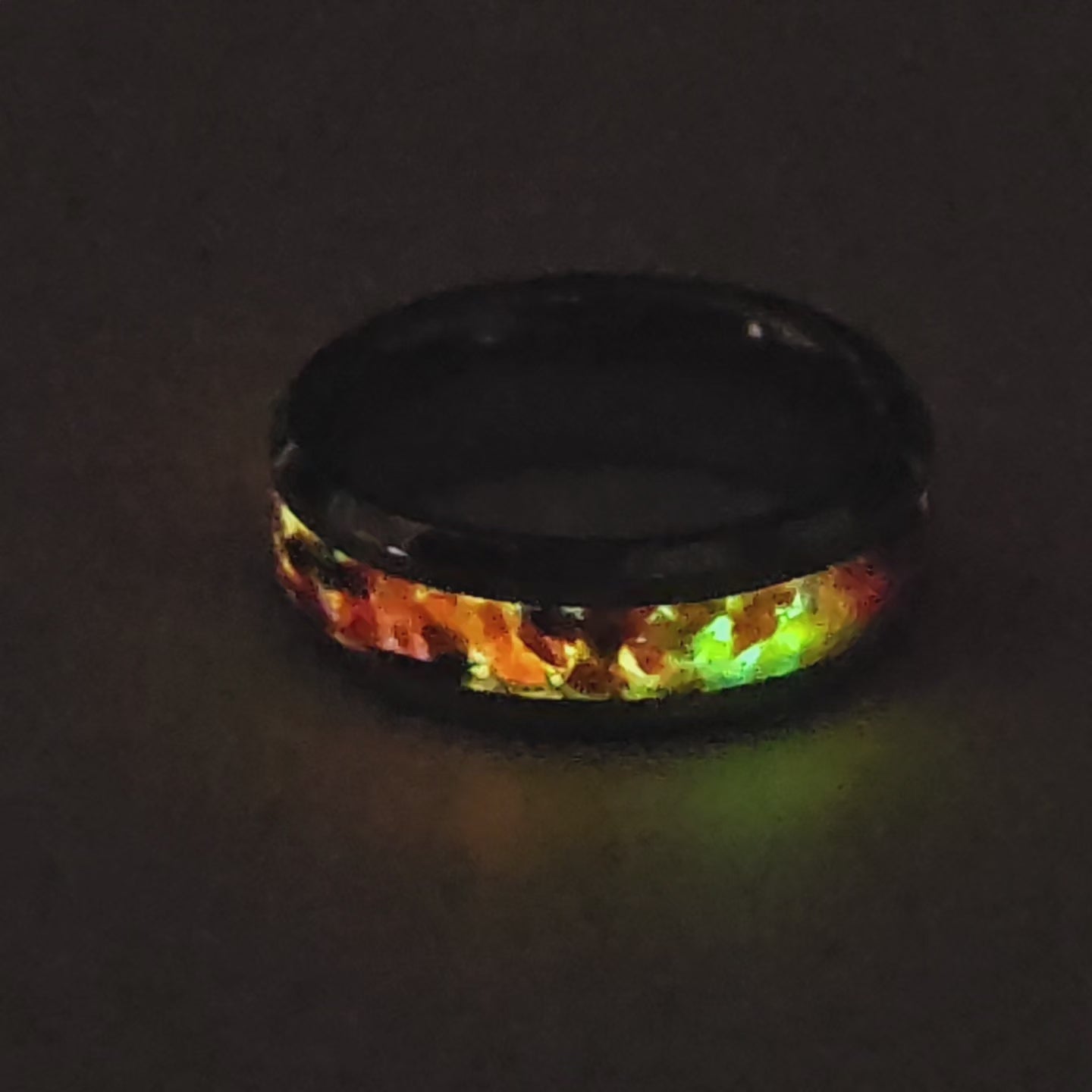 Introducing the Fire and Flame Ring! A unique Creation from Opal Glow Rings. It has a unique blend of Opal to give it a Flaming color style Red, Orange, and Yellow Glow, to make this one of a kind ring resemble a hot flame. Found ONLY at Opal Glow Rings Orders. Each order is for One ring, not a pair.