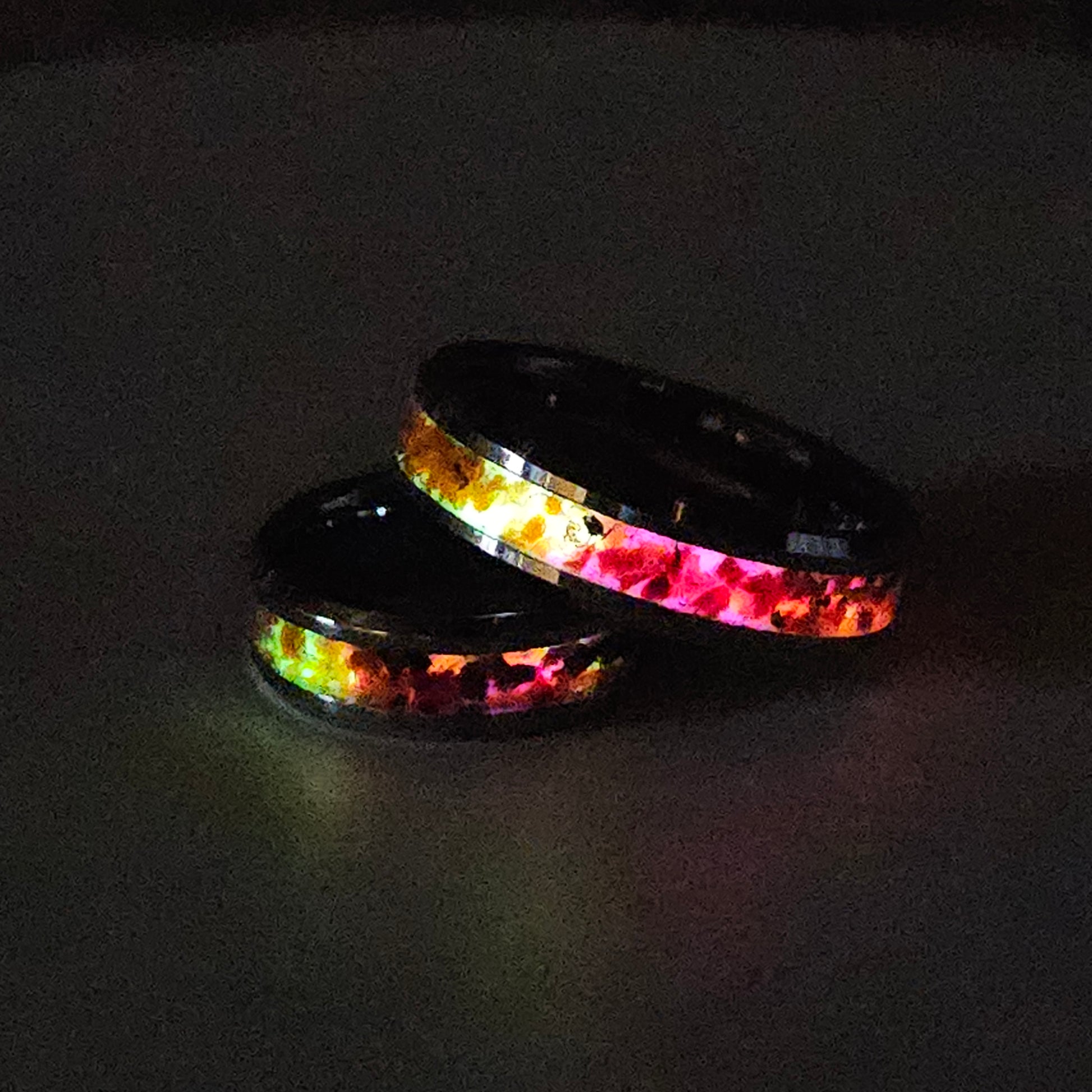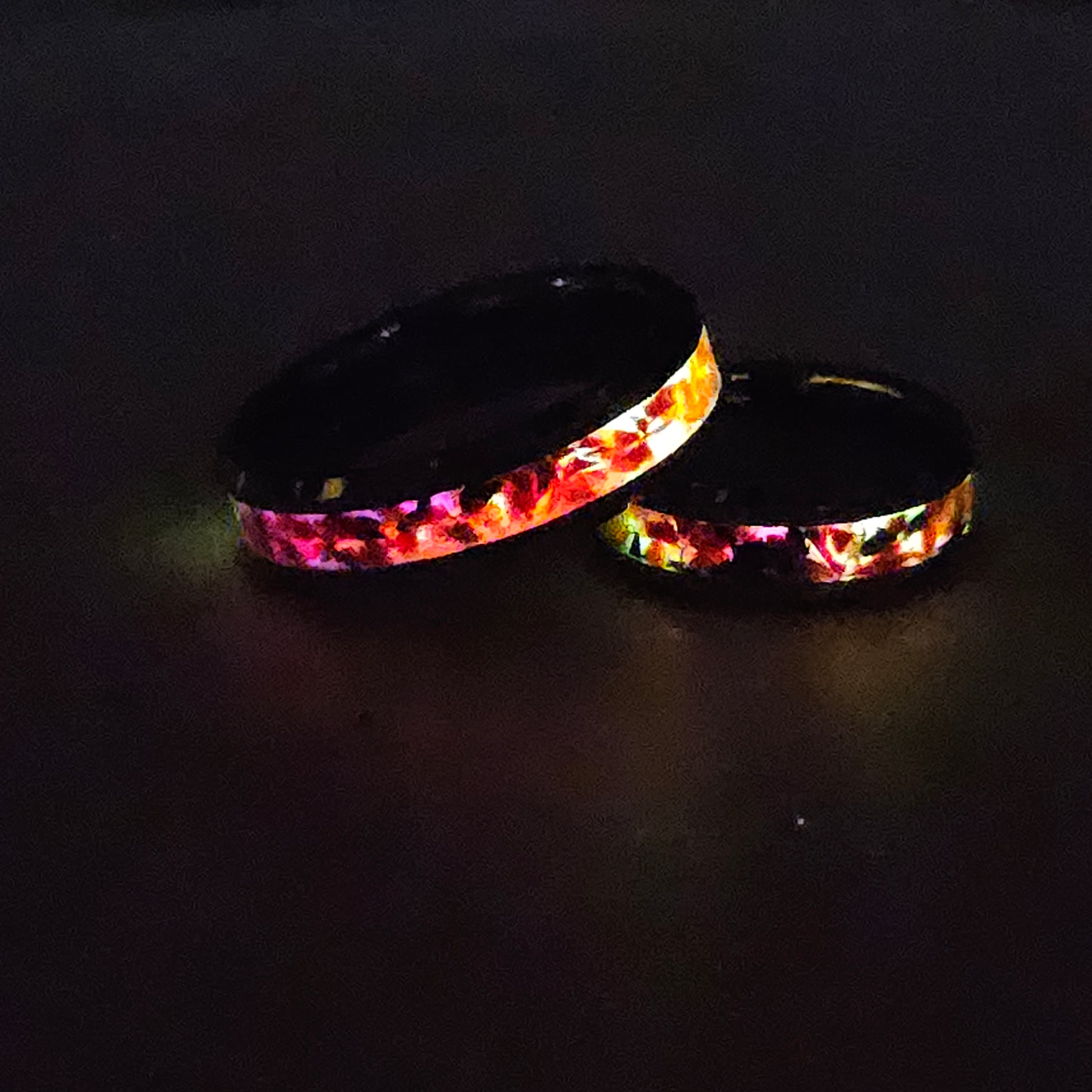 These rings are handcrafted with premium synthetic opal and the brightest ultra violet reactive glow in the dark pigment on the market. Each ring will include a small ultra violet keychain light, and a free personalized engraving up to 33 characters. I also offer free ring sizers with your purchase. You can choose between Tungsten Carbide, or Black Ceramic, both of which are scratch resistant and good for everyday wear. Select your choice in the drop down menu. Choose the style and width that you prefer, then select your size in the next menu. Each ring is handmade to order, with a shipping time of 2 weeks.